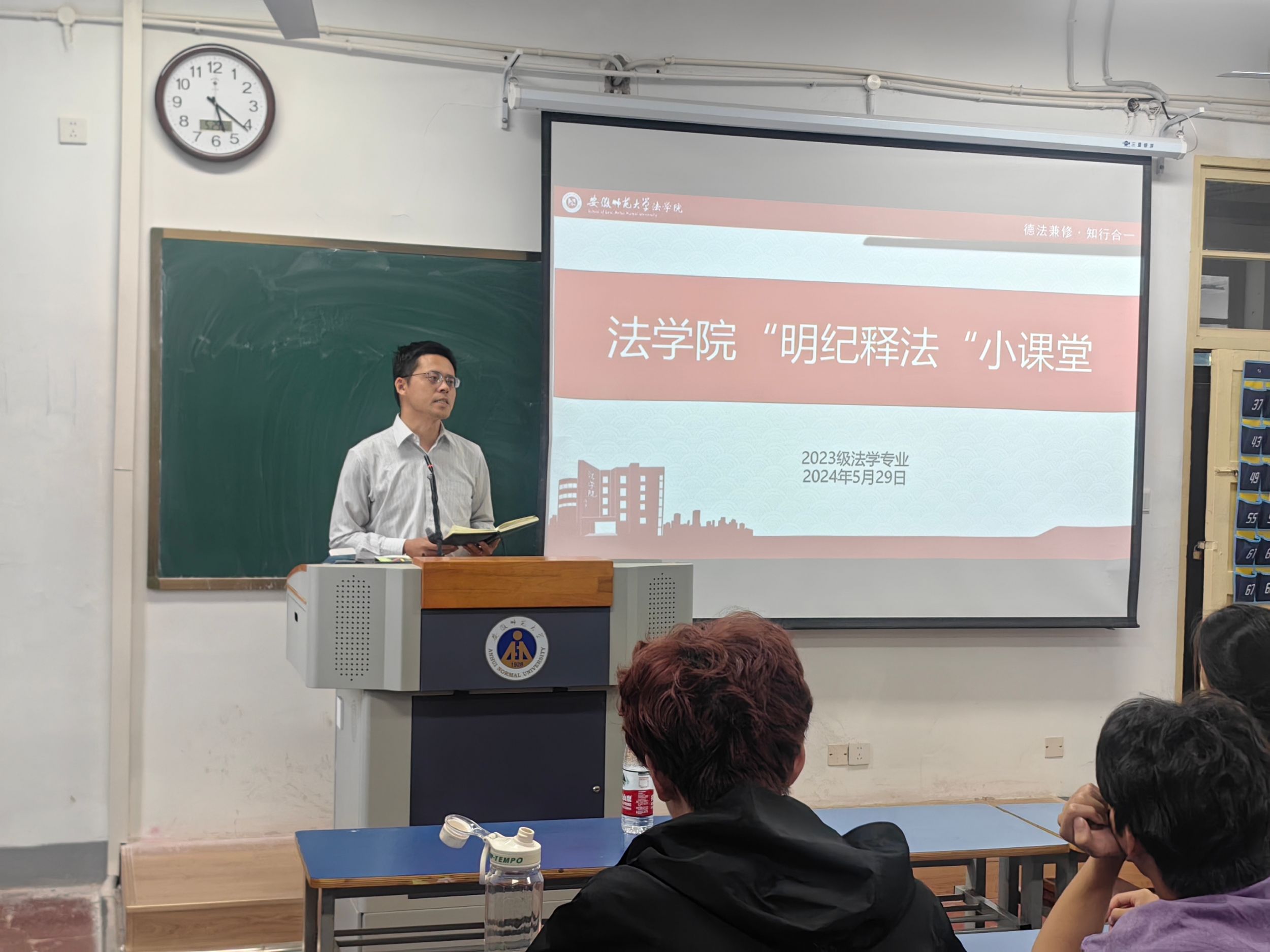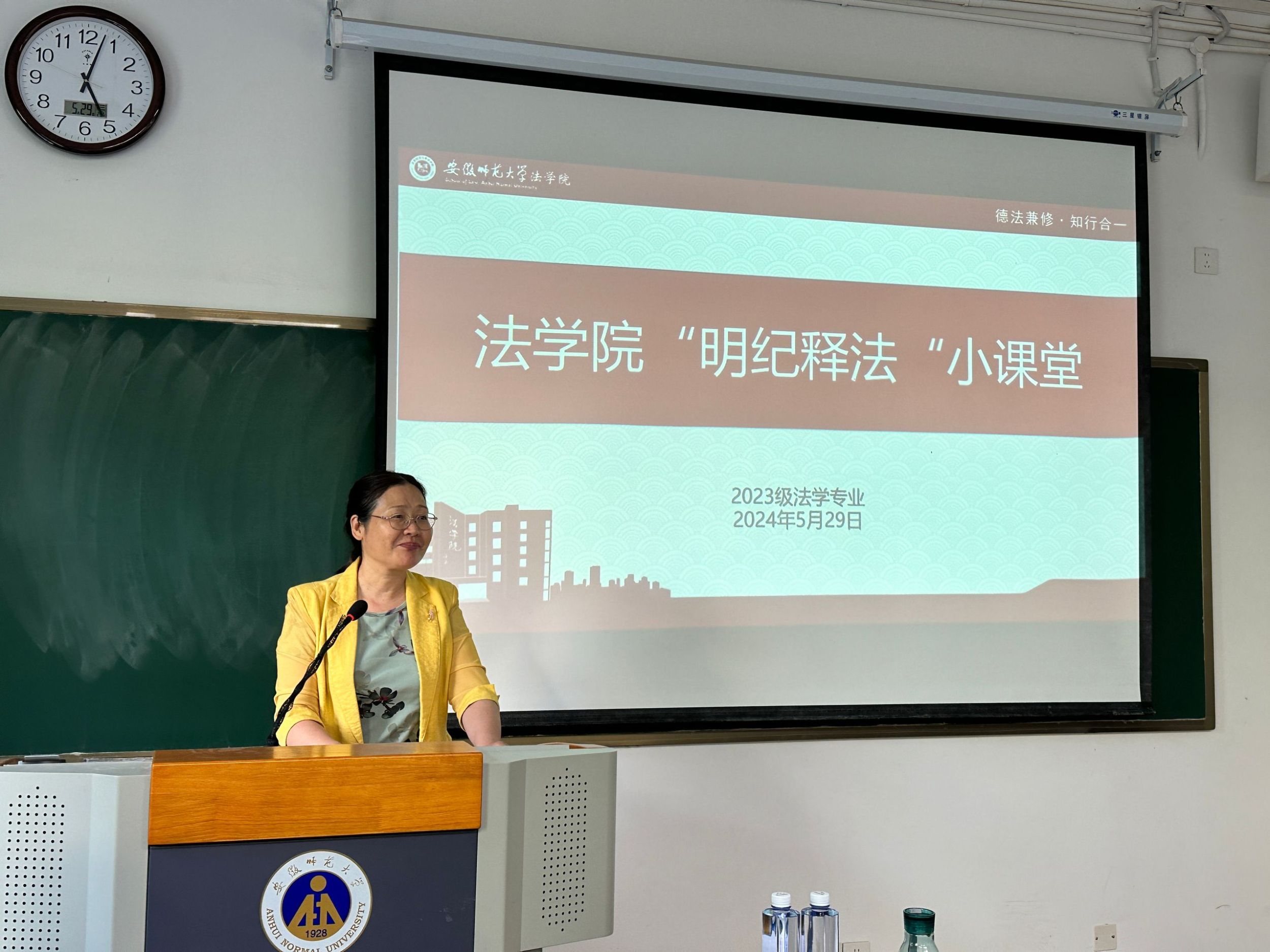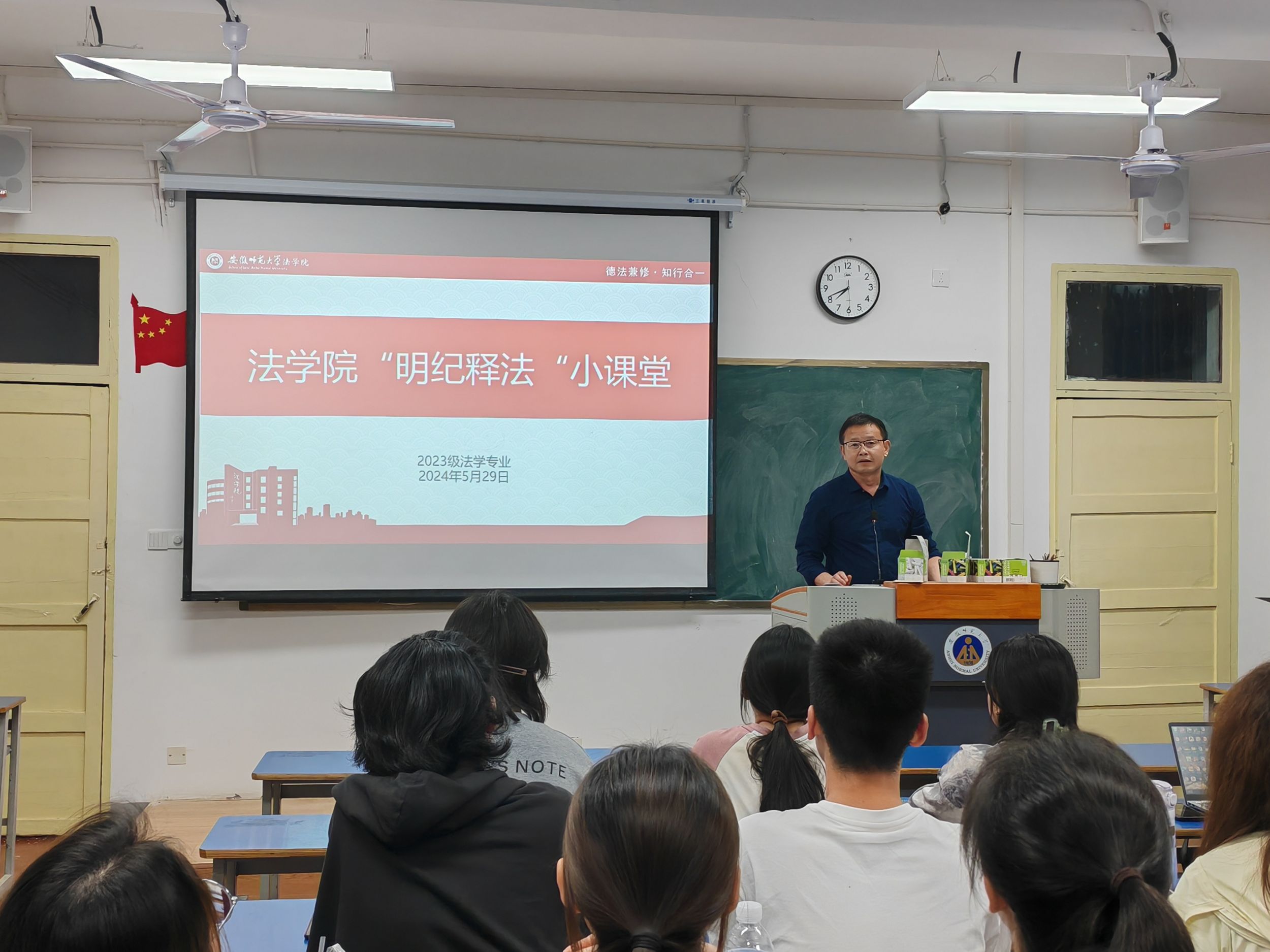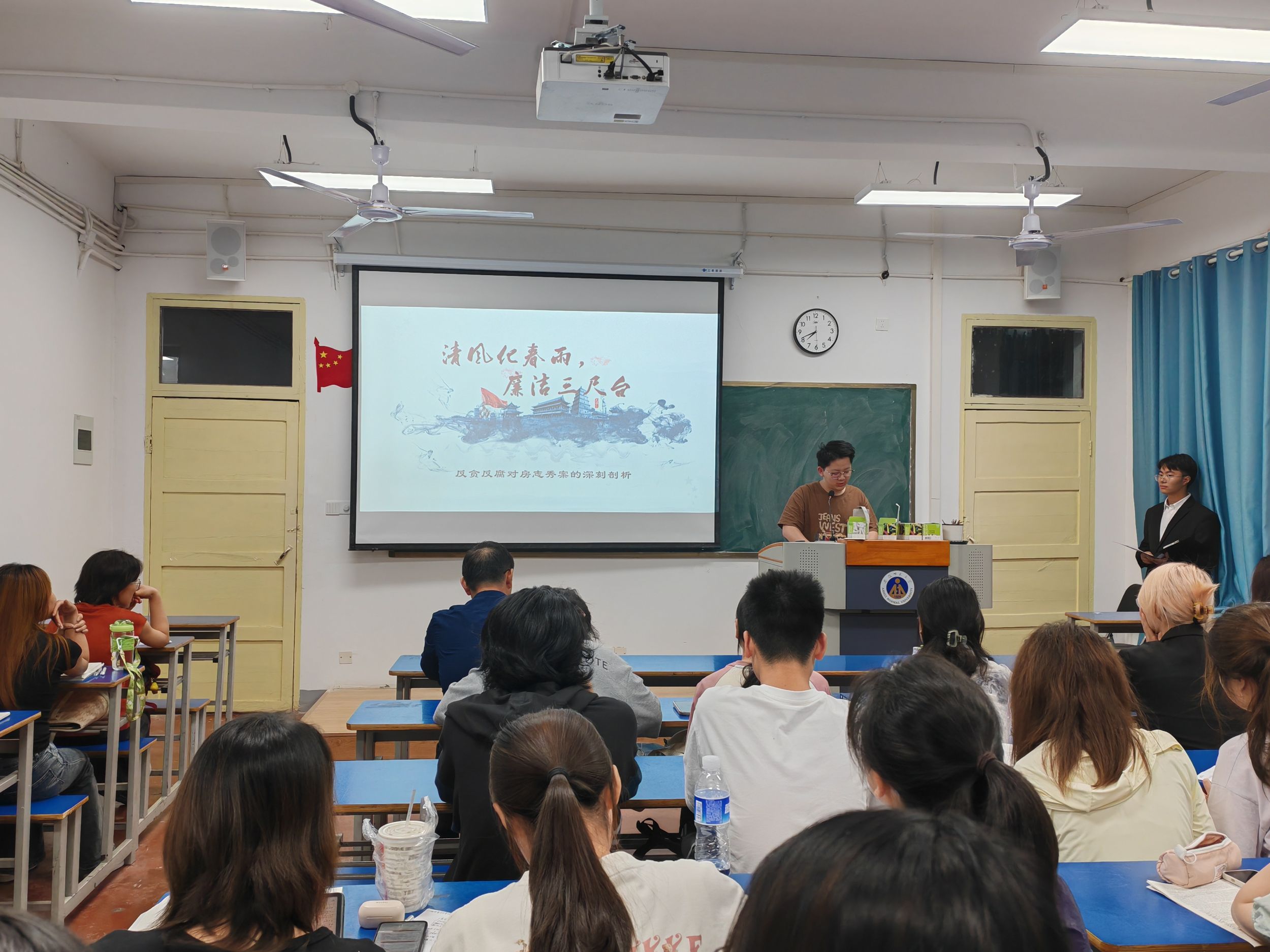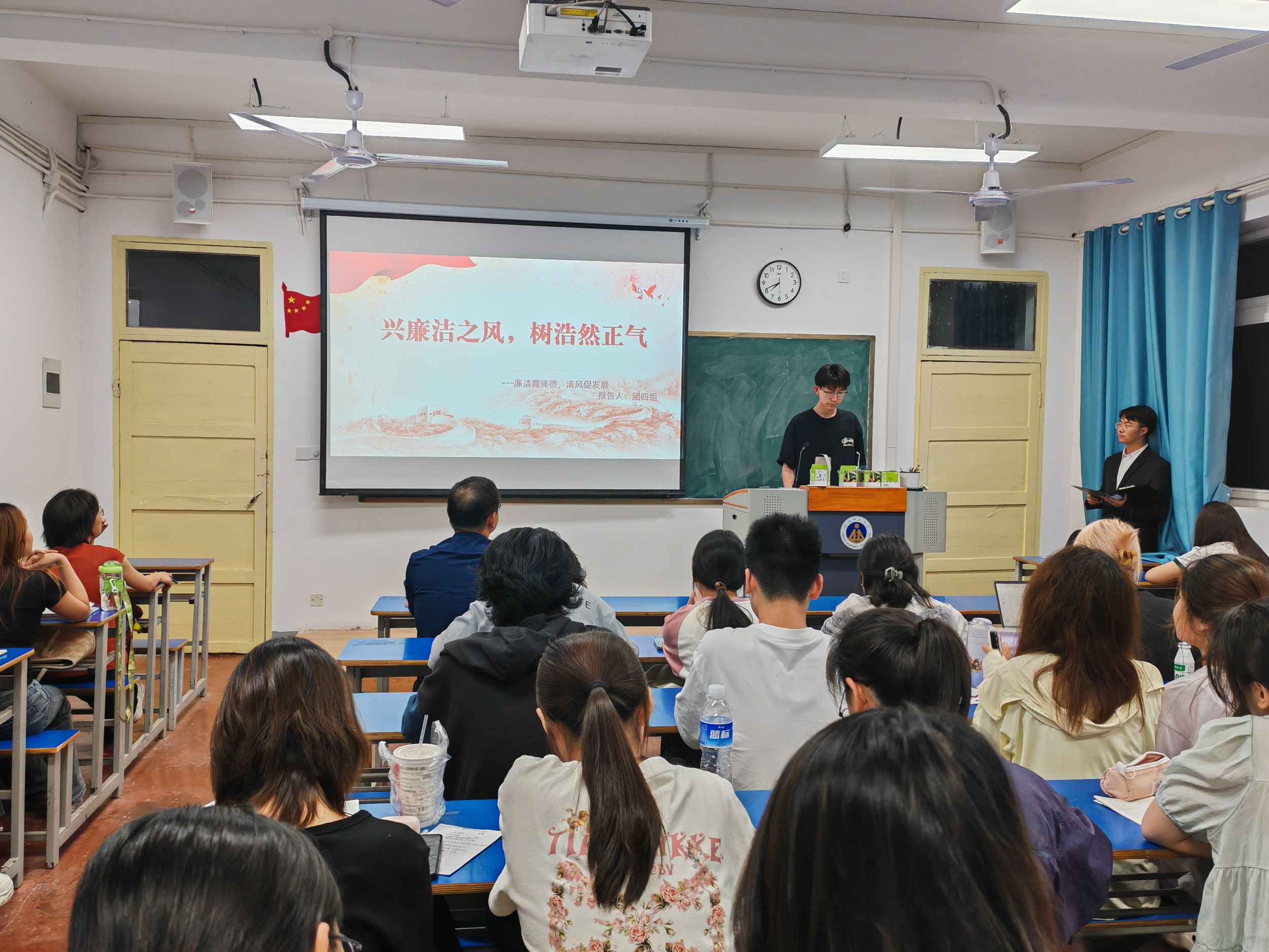 (本网讯 yl23455永利官网)为坚定不移推进全面从严治党,坚持把廉洁文化建设与学院人才培养同步推进,以理想信念强基固本,以先进文化启智润心,以高尚道德砥砺品格,帮助大学生筑牢安全防线,提高法律意识和规矩意识。5月29日下午,yl23455永利官网2023级本科生于天门山校区开展主题为“廉洁育师德,清风促发展”明纪释法小课堂活动。活动由各班级学生干部主持,yl23455永利官网党委书记赵红、党委副书记张玉新、副院长徐成文、院长助理陈银珠莅临指导,2023级辅导员和全体本科生集体参加。