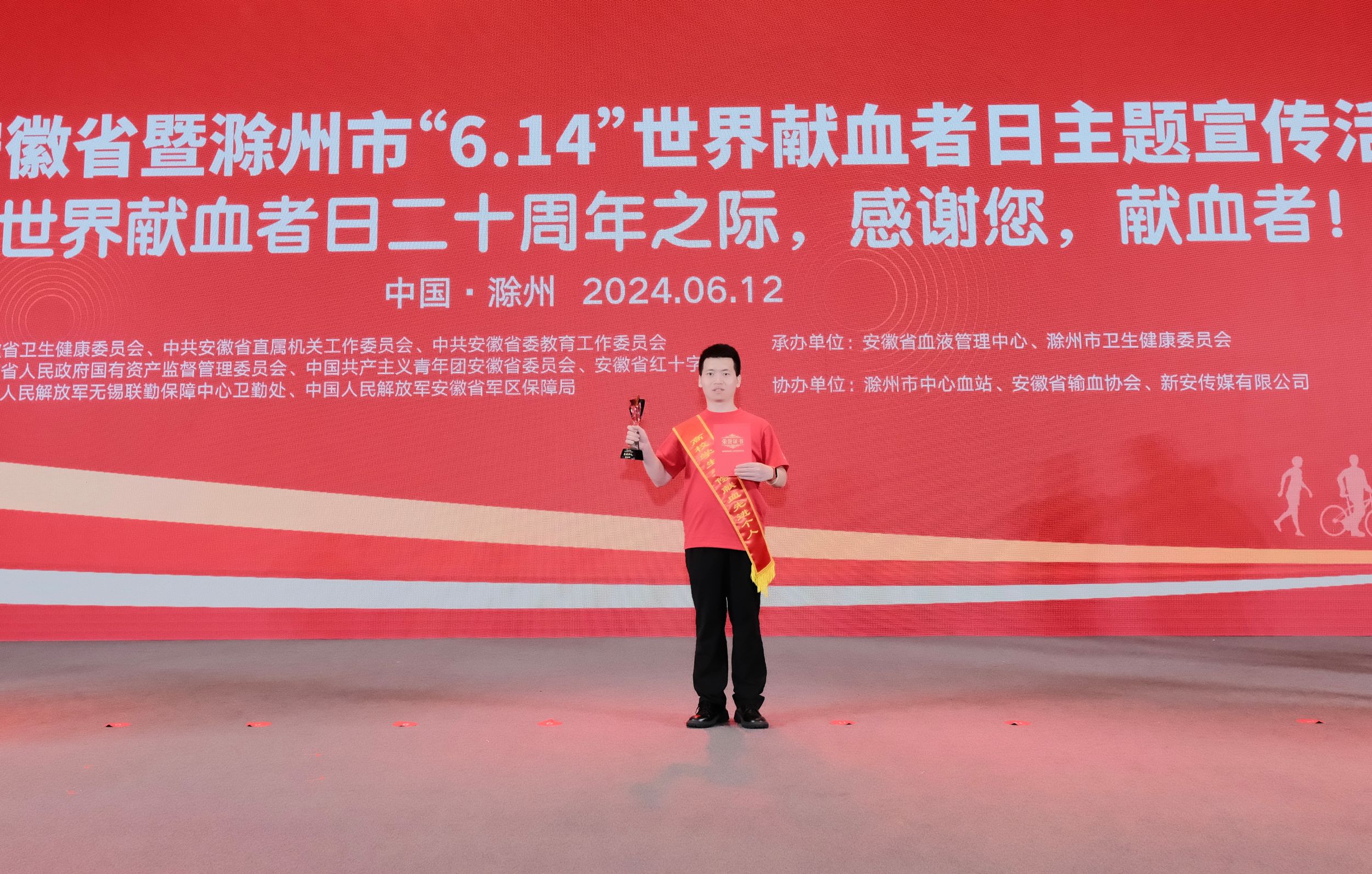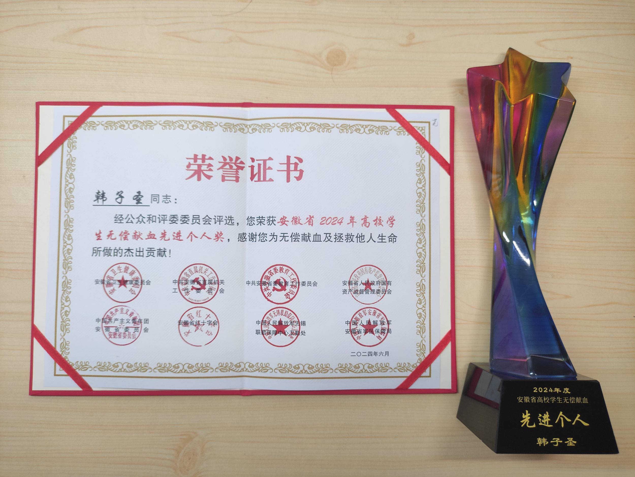 2024年6月12日,安徽省2024年无偿献血公益之星、高校学生无偿献血先进个人和先进集体评选表彰活动暨安徽省“世界献血者日”主题宣传活动在滁州举办。我院2022级政治学专业硕士研究生韩子圣获评安徽省高校学生无偿献血先进个人,系学校近年来唯一获得此项荣誉的学生。