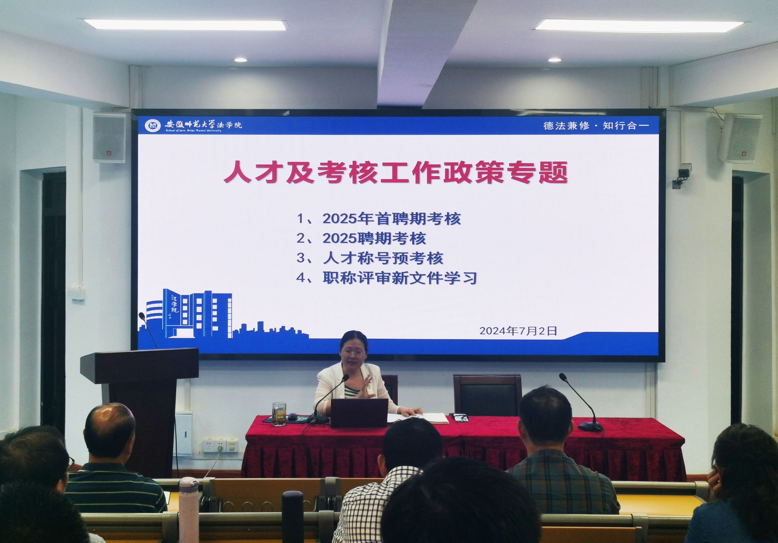 会上,赵红带领大家学习了校人字〔2024〕24号文件《关于印发安徽师范大学专业技术资格评审条件的通知》,对2025年职称评定的新增要求和新增变化作了详细解读,就2025年首聘期考核、聘期考核、人才称号考核工作涉及到的老师和考核依据作了重点提醒。她强调,即将到来的暑假是科研产出黄金期,科研工作不仅关乎教师个人发展,也关乎学院整体发展。希望老师们利用假期休整的时候,多沉下来深入科研,为考核工作做好准备。