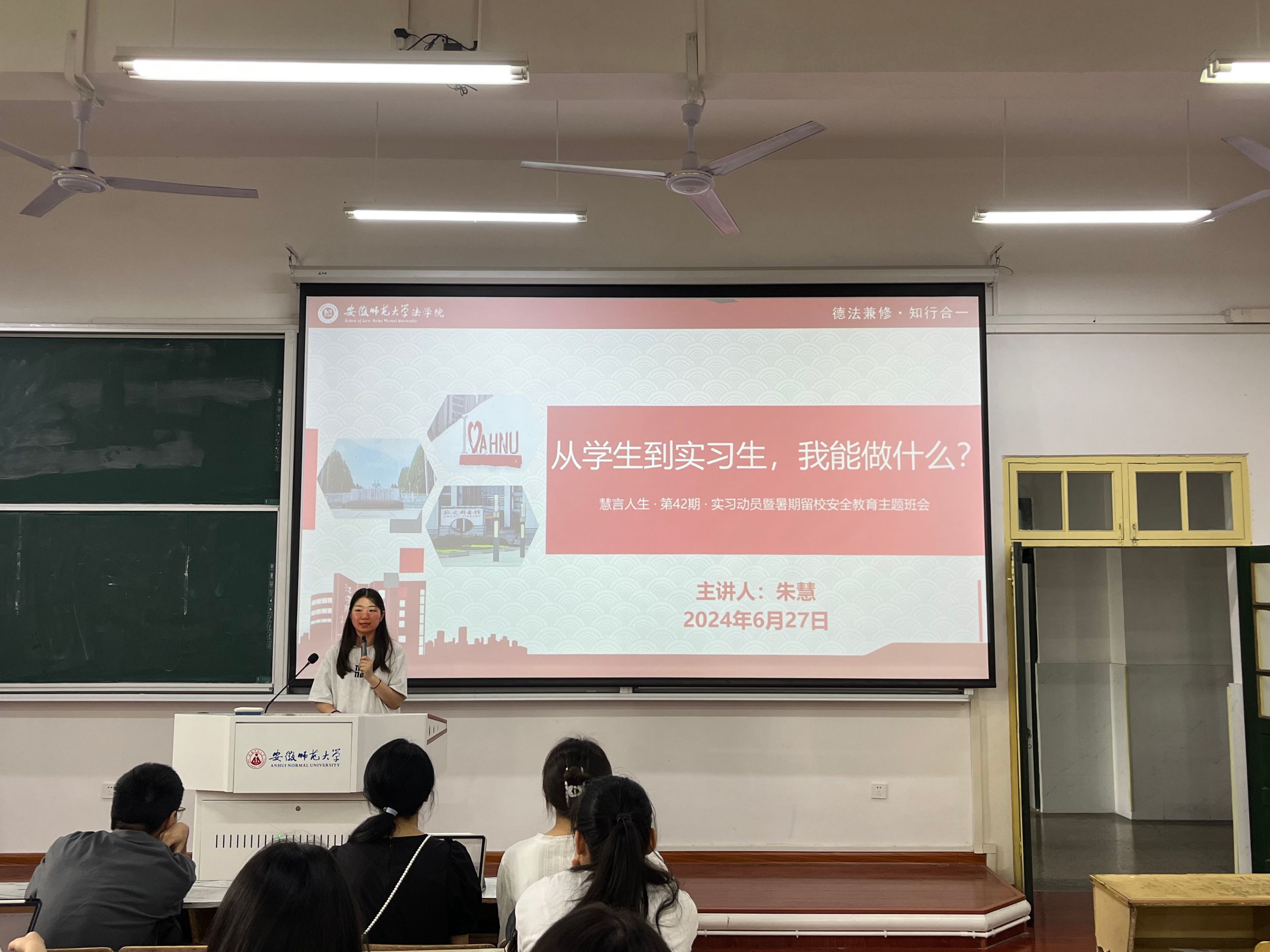 6月27日上午,2022级法学(卓越司法)专业于教学楼1401教室召开实习动员会。班会由辅导员朱慧主持,2022级法学(卓越司法)专业全体同学参加。