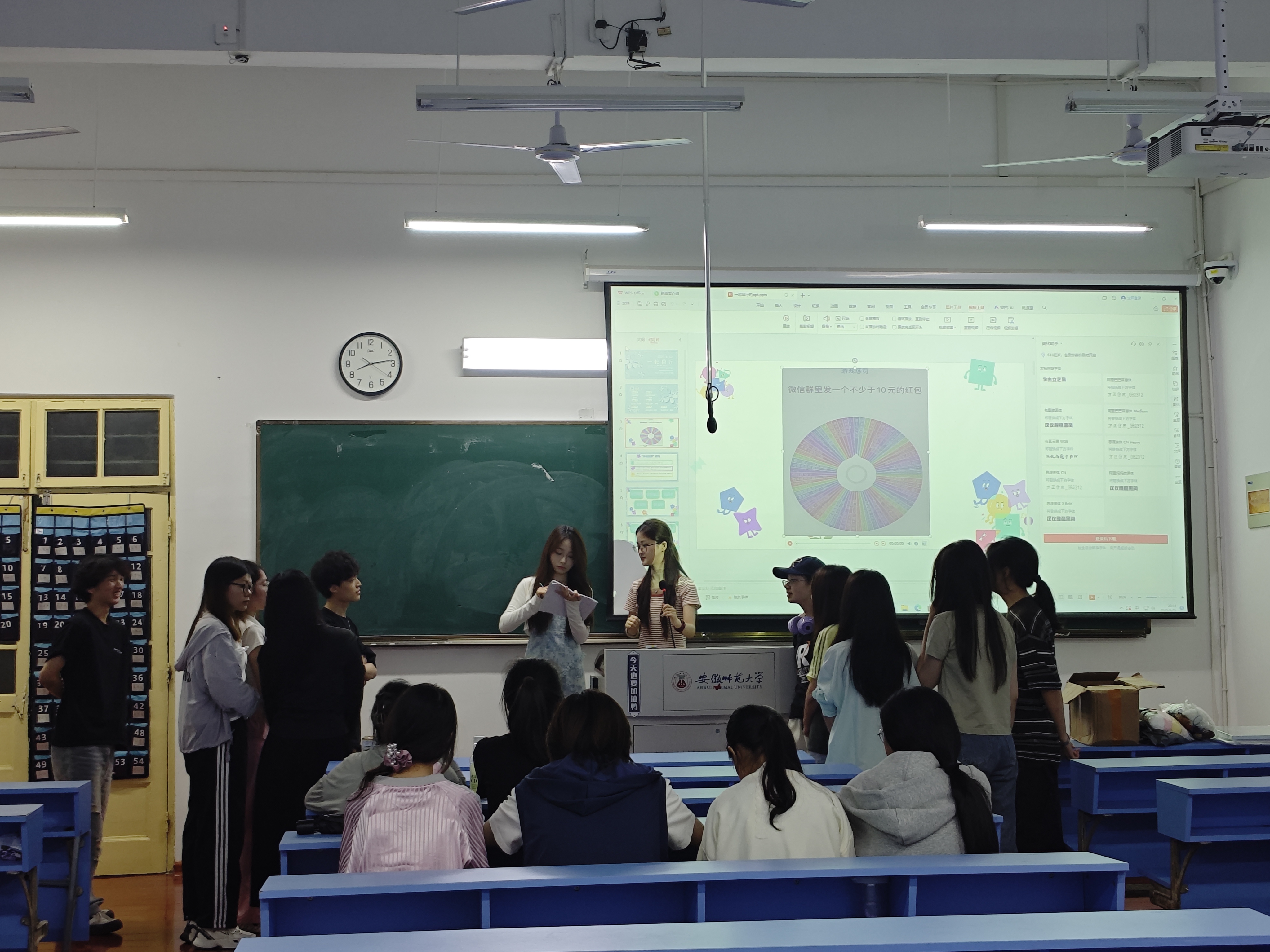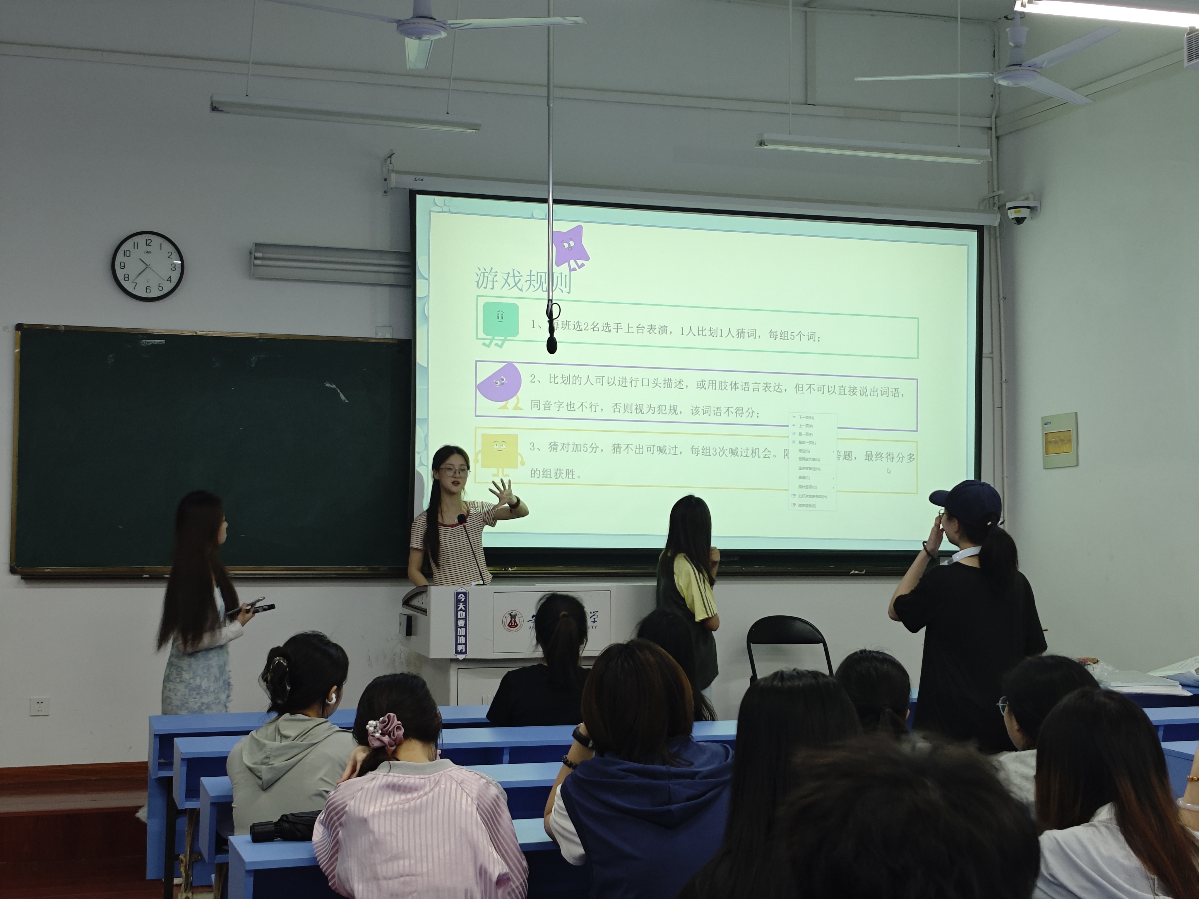 活动精心设计多轮互动环节。“你画我猜”游戏中,班级代表两两配合,用肢体语言传递关键词,现场笑声不断;“不能说的秘密”游戏里,各宿舍成员默契规避“炸弹词”,策略比拼精彩纷呈。“三词造句”与“故事接龙”环节则考验创意与逻辑,同学们脑洞大开,让文字在合作中绽放趣味。在每轮游戏间隔,何秋竺、陈子昕、张朗宁同学的才艺表演,更是用歌声点燃现场氛围。